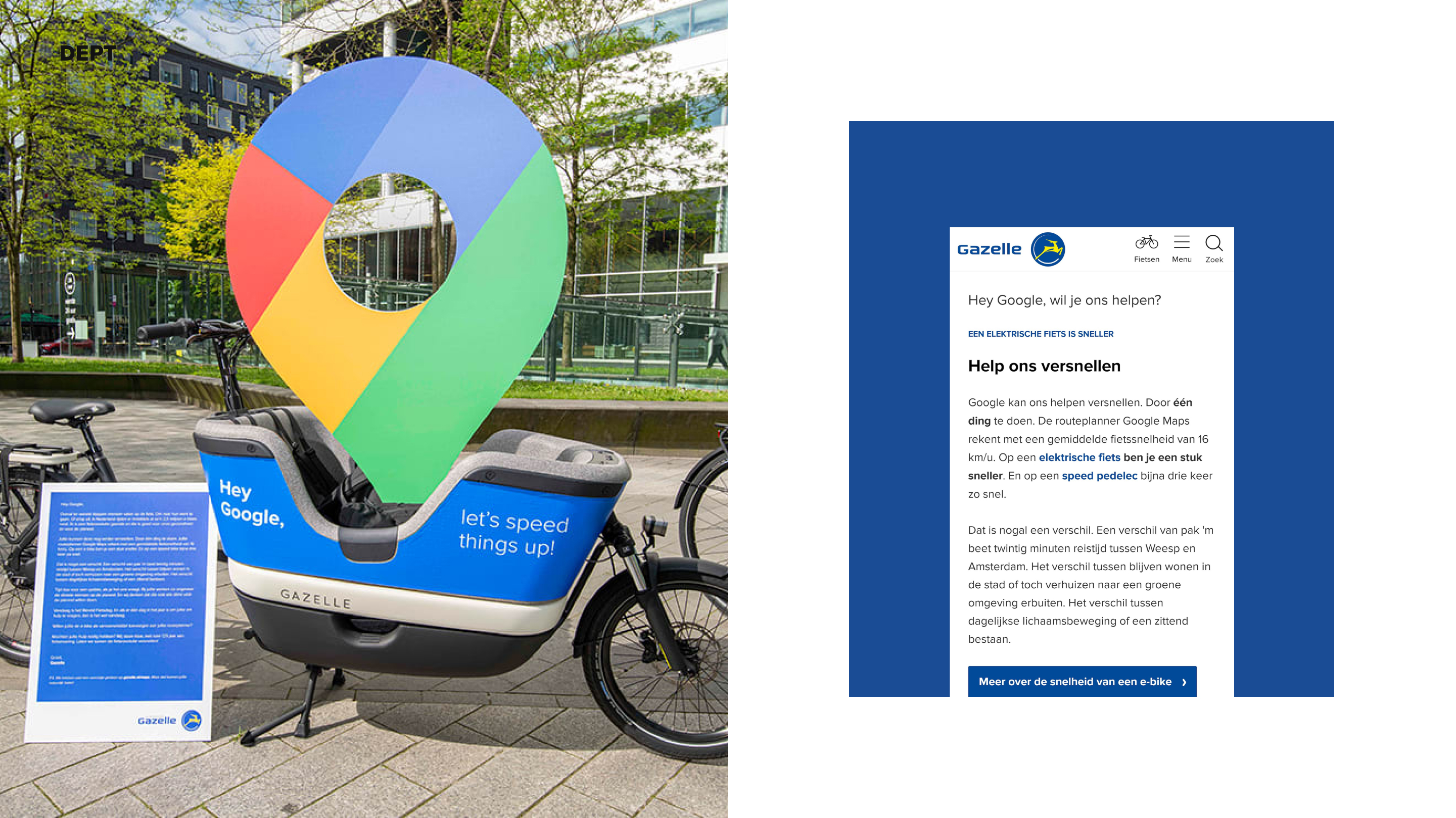 Mit Blick auf den Weltfahrradtag und die wachsende Zahl von E-Bikes sah Gazelle eine Gelegenheit, auf eine andere Art und Weise Aufmerksamkeit zu erregen. Und zwar durch den Aufbau eines eigenen Routenplaners für E-Bikes. Der Fahrradspezialist kündigte dies in einer öffentlichen Nachricht an Google an, in dem er darum bat, Google Maps für E-Bikes zu erweitern. DEPT® hat Gazelle bei der Konzeption, dem Design und der Entwicklung eines E-Bike-Routenplaners unterstützt, um gemeinsam die Fahrradrevolution voranzutreiben.