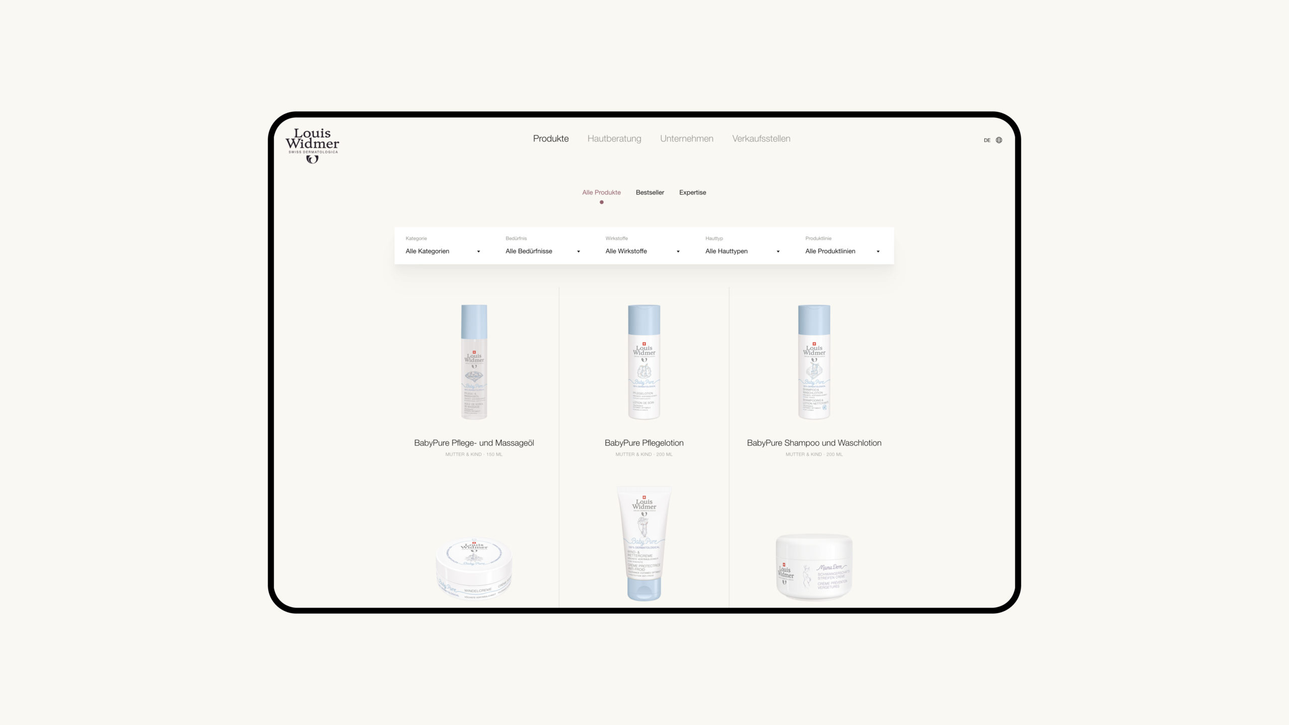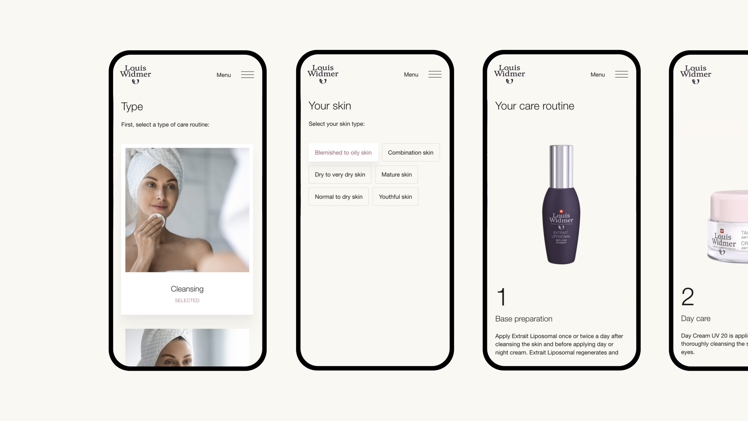 Die Marke Louis Widmer, bis heute in Familienbesitz, steht für fundierte Forschung und höchste Qualität – und das seit der Gründung 1960. Diese Schlüsselwerte der Firma sollten durch das neue Branding und Marketing unterstrichen werden. Ausserdem sollte die neue Website als Herzstück den Nutzer:innen eine qualitative Beratung im digitalen Raum bieten. So, dass User:innen auch ohne die Hilfe von Expert:innen schnell das für ihren Hauttyp passende Produkt finden.