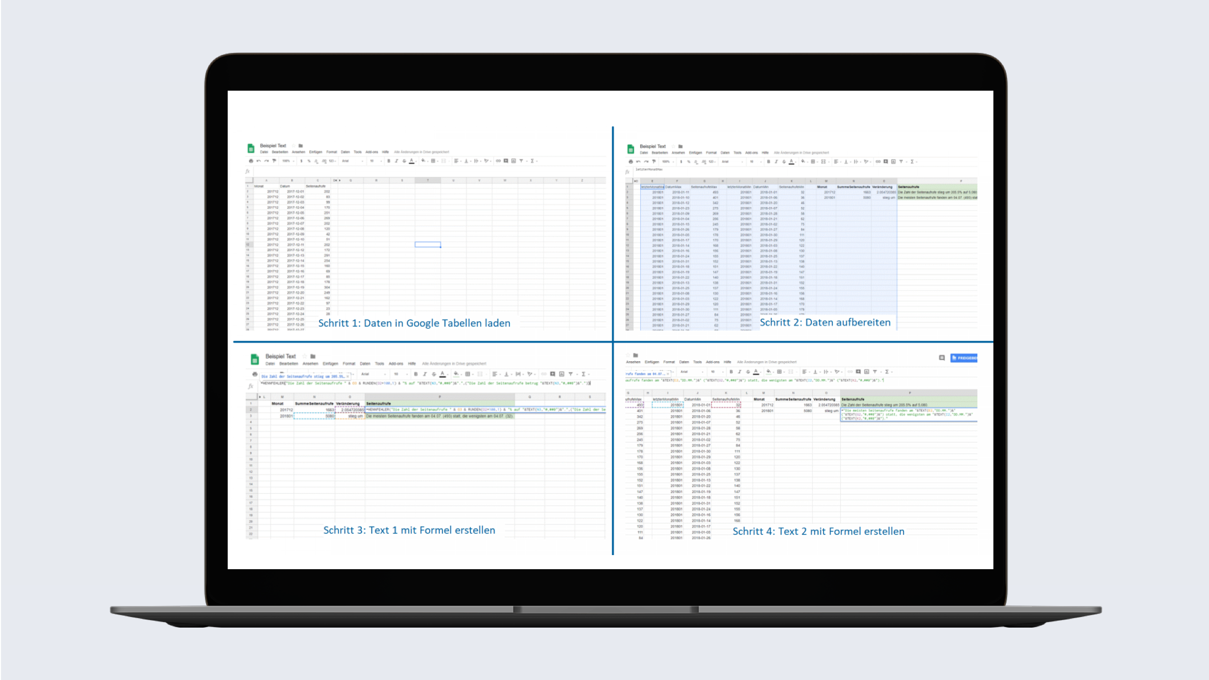 Mit etwas Kreativität und wenig Aufwand, kann mithilfe von Google-Tabellen ein interaktiver Text erstellt werden. Der Text aus der Abbildung 3 (Schritt 4) basiert auf einer Formel mit einer Kombination der Daten aus Google Analytics. Diese passt sich nach einer entsprechenden Monatsentwicklung der Zahlen (im Beispiel „Seitenaufrufe“) automatisch an. Hierfür sind vertiefte Formel-Kenntnisse (siehe Abbildung 2) eine wichtige Voraussetzung!