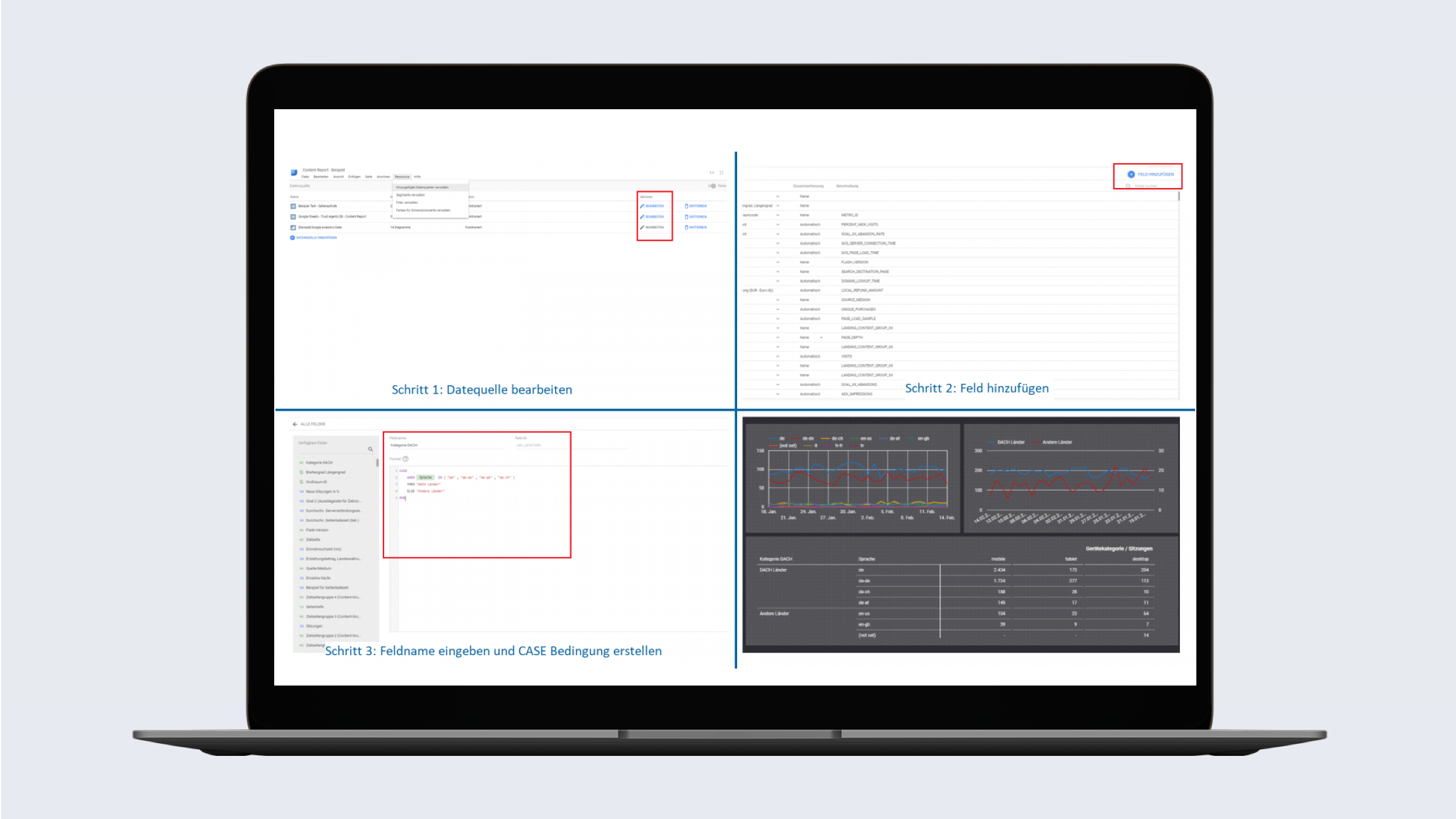 Mithilfe von bedingten Ausdrücken, den CASE Anweisungen, die in den Formel-Bereich eingegeben werden, lassen sich anspruchsvollere Aufgaben erstellen: z. B. das Erstellen von individuellen Kategorien (DACH Länder und Restliche Länder; Abbildung 4).