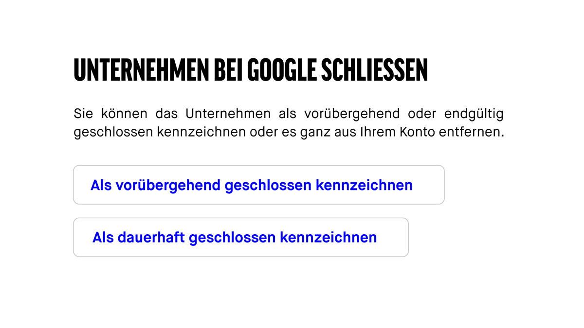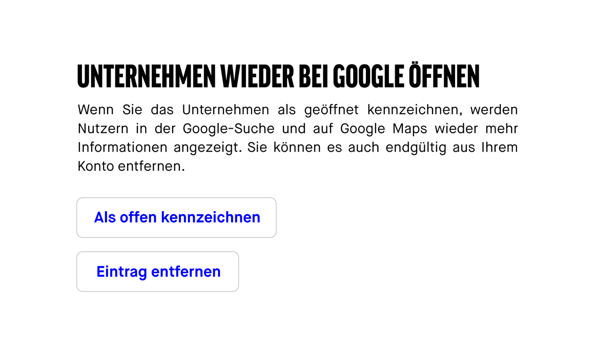 Zum Schutz der Bevölkerung vor COVID-19 ordnete der Bund die Schliessung vieler Unternehmen an. Um diesen Umstand transparent an Kund:innen zu kommunizieren, sollten Unternehmen diesen Status nicht nur auf ihrer Website an prominenter Stelle vermerken, sondern auch an anderen häufig frequentierten virtuellen Orten – beispielsweise auf Google Maps.