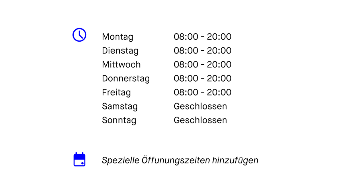 Öffnungszeiten und “spezielle Öffnungszeiten” (gedacht für temporär angepasste Öffnungszeiten wie etwa an Feiertagen – oder eben während einer COVID-19 Krise) können ebenfalls in der Rubrik “Info” angepasst werden: