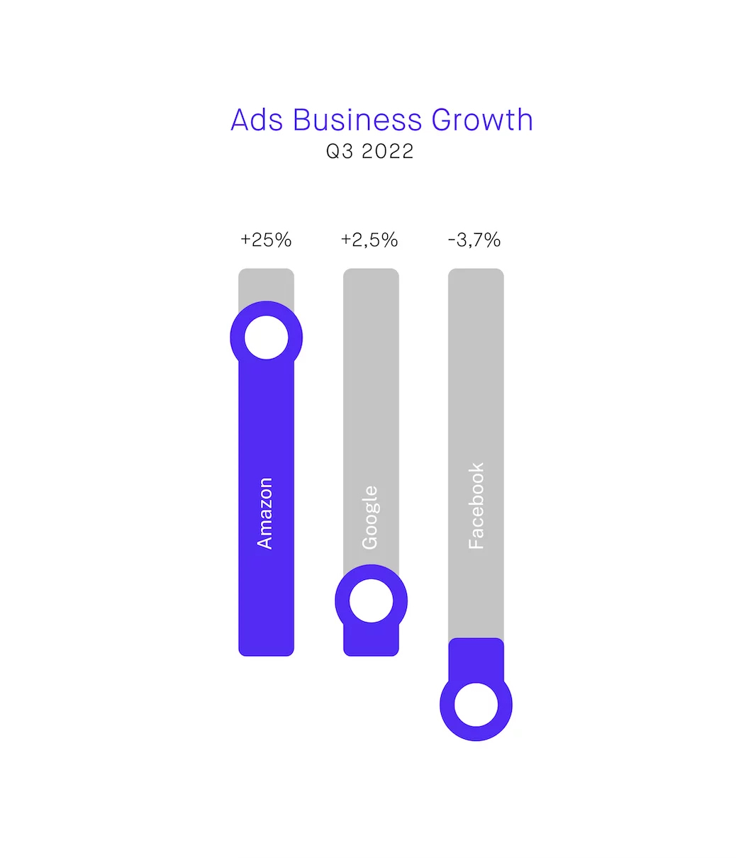 In Q3 of 2022, Amazon’s ads revenue grew 25% to $9.5 billion – an impressive 10 times higher than Google’s advertising revenue growth, which also includes YouTube. Facebook, including Instagram, even saw a decrease in 2022, dropping 3.7%, closing the gap between Facebook and Amazon even more.
