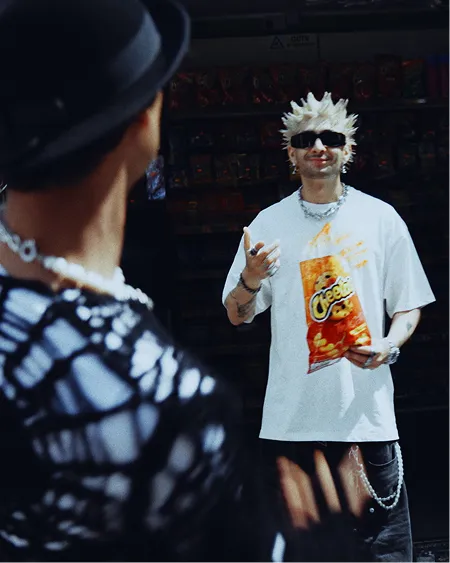 Next, we invited the creators to flex their creative juices with a refreshingly simple brief: Style Navinder’s tee your way, head to a corner shop of your choosing, grab a bag of Cheetos, and— yes—wipe that trademark Cheetle dust on yourself to drive home the message.