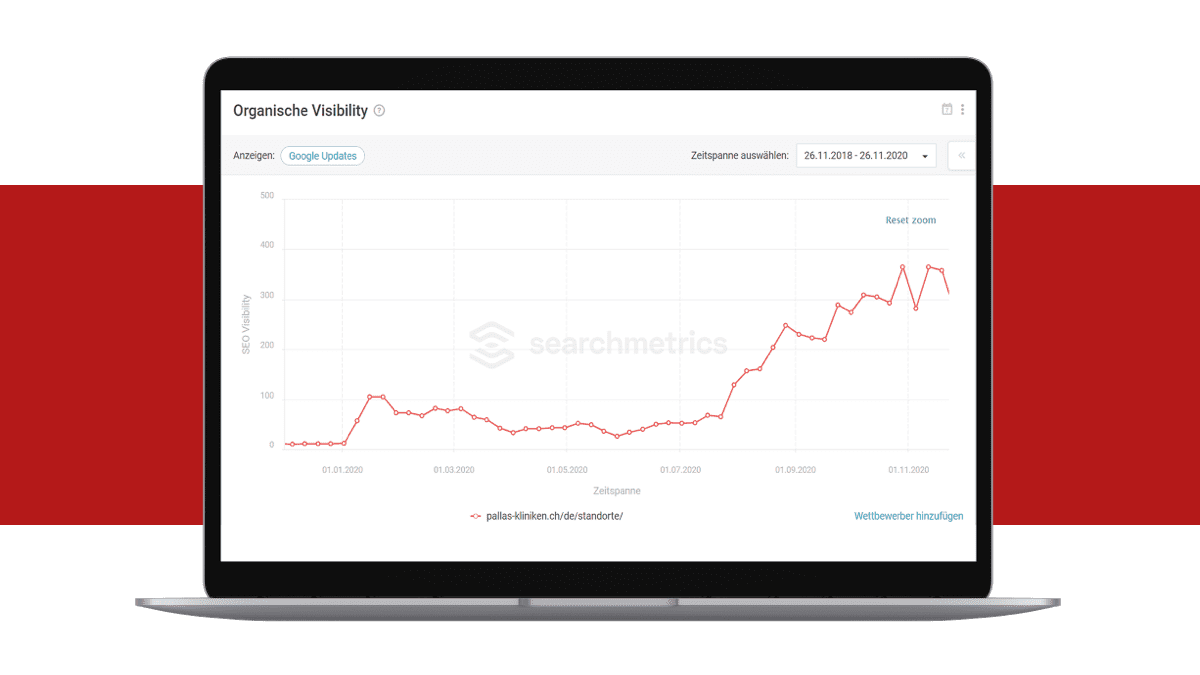 • Verdreifachung der Sichtbarkeit von Standortseiten in der organischen Google Suche gemäss Searchmetrics Research Cloud SEO Sichtbarkeit auf google.ch