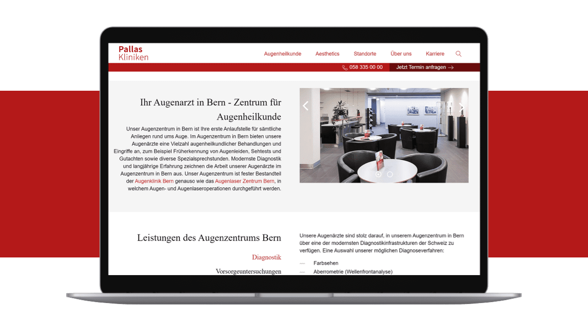 Medizinische Dienstleistungen und Dienstleister werden in hohem Masse mit standortbezogenen Suchanfragen gesucht (z.B. “Augenarzt Bern”). Die Pallas Kliniken und DEPT® haben an diesem Micro Moment in der Customer Journey Massnahmen getroffen, um die Auffindbarkeit von Augenheilkunde Services für Patient:innen und Kund:innen deutlich zu steigern.