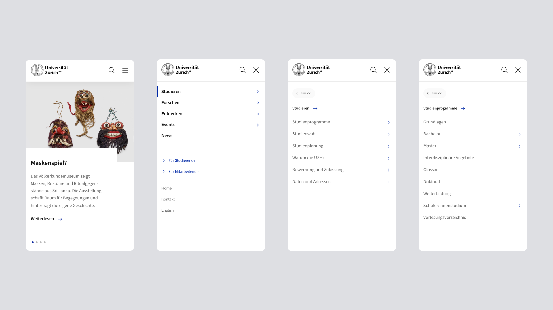 Bis 2020 wurden die Grundlagen für den Webrelaunch ausgelotet und definiert – von der Vision für den zukünftigen Auftritt über Konzept- und Designvarianten bis zu einem pragmatischen Entscheid: Die im bisherigen Content-Management-System durch die IT-Abteilung der UZH erstellten und verwalteten Inhalte wie Backend-Umsetzung, Contentshifts etc. bleiben unangetastet, um diese beim Golive automatisiert migrieren zu können. Somit lag für uns der Fokus des Hauptprojektes auf dem Frontend: Neugestaltung und bei Bedarf Neuentwicklung der Templates und Komponenten, die den Stil, das Design und die Organisation der Inhalte auf den Seiten bestimmen.
