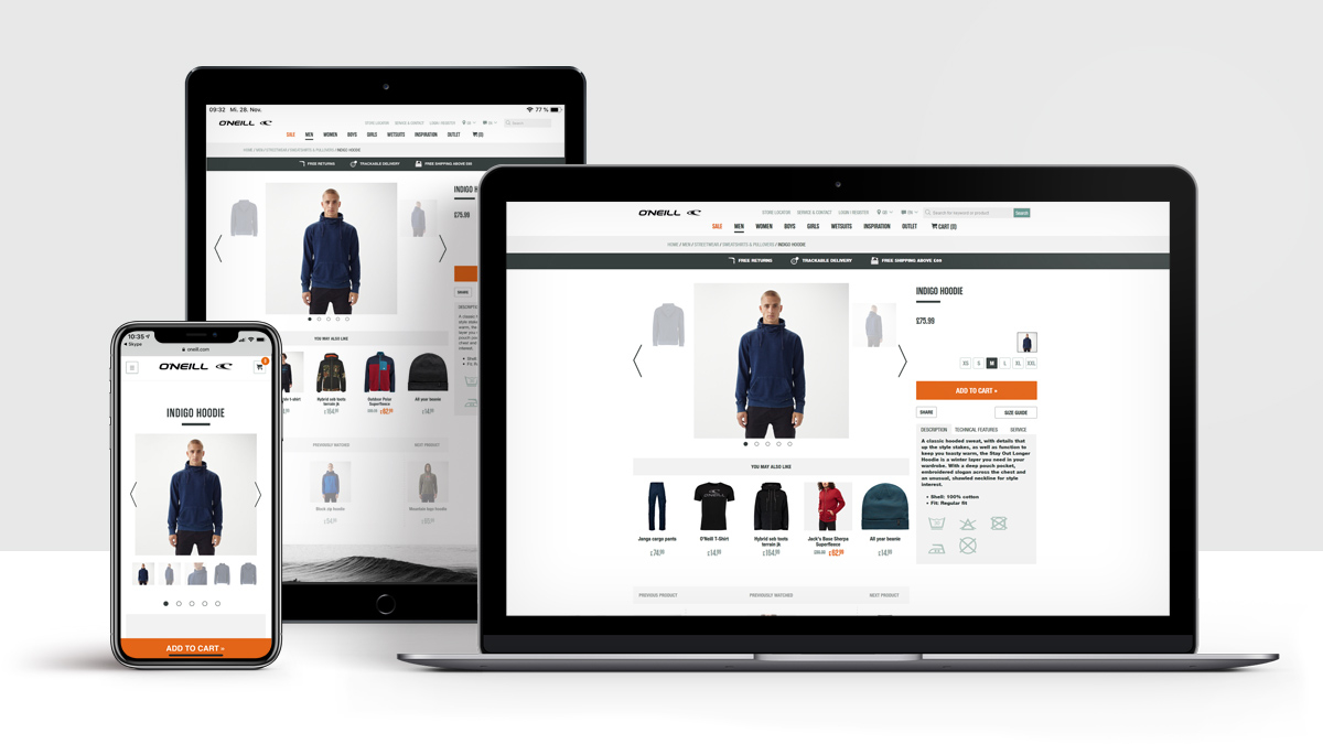 Im Februar 2014 gingen parallel alle europäischen O’Neill-Shopseiten auf der neuen Salesforce Commerce Cloud-Plattform live. Der Content aus dem bisherigen Markenportal wurde zu grossen Teilen in den neuen Shop migriert, sodass die Kund:innen ein einzigartiges Marken- und Einkaufserlebnis erfahren. Funktionalitäten wie zum Beispiel der neue Quick-Checkout führen zu einem intuitiveren und zielgerichteteren Verkaufsprozess und erhöhen gleichzeitig O´Neills Conversion Rate. Ein Anstieg der Verkaufszahlen konnte über die Einführung des Tablet-First-Approaches sowie über die Implementierung der optimierten mobilen Version erreicht werden.
