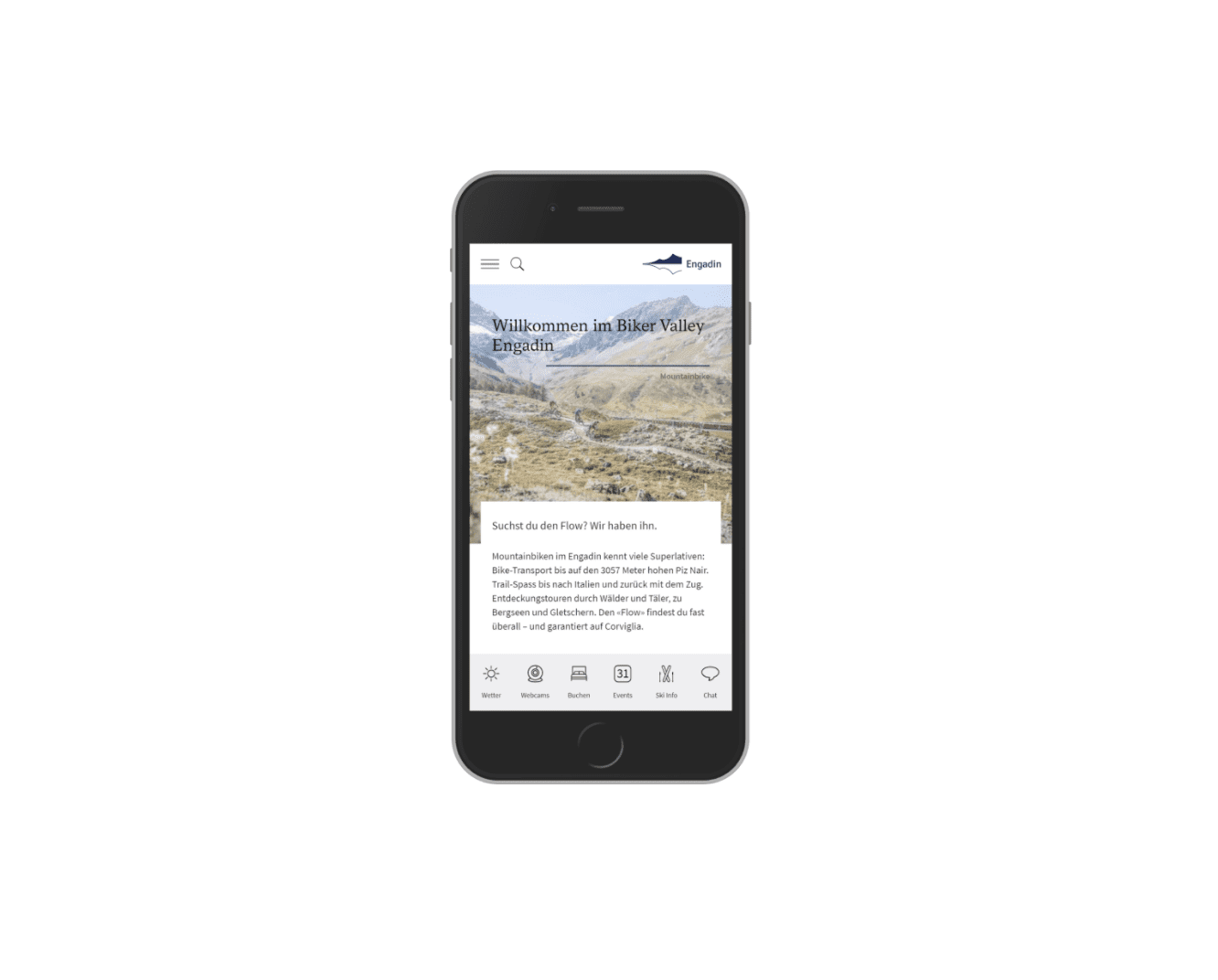 - Technologie: Basierend auf dem performanten und flexiblen Framework React wurden sowohl Autor:innen-Inhalte als auch verschiedene Datensätze zu Orten im Engadin (Events, Standorte, Öffnungszeiten etc.) nahtlos in einem ansprechenden Frontend abgebildet. Dabei wurden auch folgende Funktionalitäten eingebunden: Buchen, Reservieren, Angebote und Packages, Webcams und Wetterdaten, Pistenberichte, Kontaktmöglichkeiten via Chat und mehr.