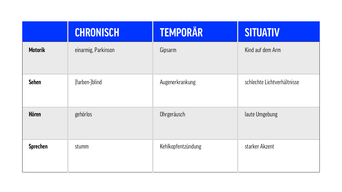 Grundsätzlich profitieren alle Menschen von Accessibility, die in einer notwendigen Fähigkeit zur Nutzung digitaler Produkte eingeschränkt sind. Eine beispielhafte Übersicht über die vier relevanten Fähigkeiten, die chronisch, temporär oder situativ eingeschränkt sein können: