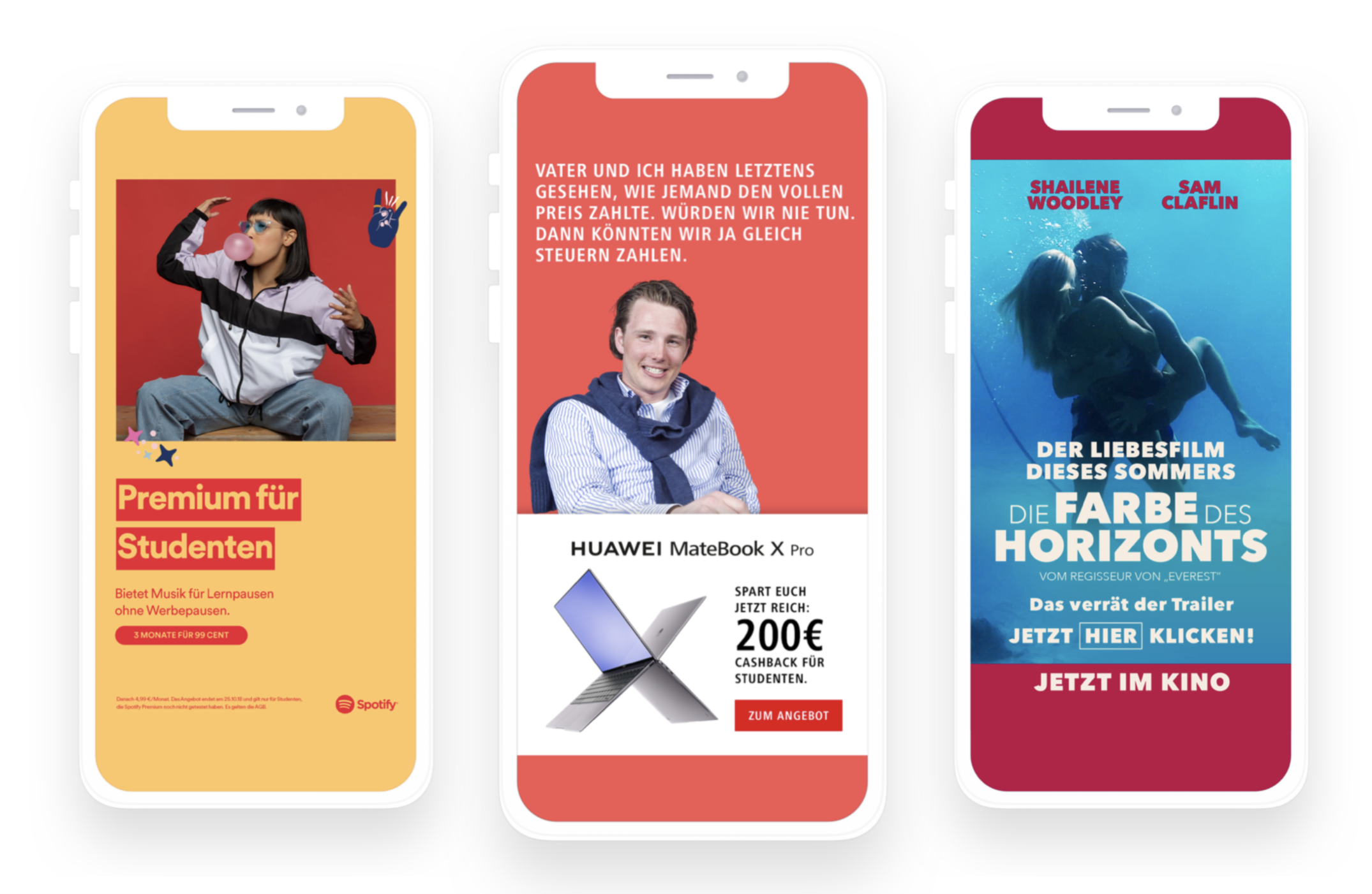Spotify bot über diese Ads eine vergünstigte Premium-Mitgliedschaft explizit für Studierende an und Telekommunikationsausrüster Huawei bediente sich im Meme-Regal, um sein Huawei Matebook X Pro mit dem populären Character des BWL Justus zu promoten. Für ein Budget von 10.000€ wurde diese Ad an alle Jodel User:innen Deutschlands ausgespielt und generierte dabei 1.100.000 Impressions, 25.555 Klicks und 1.263 Shares.