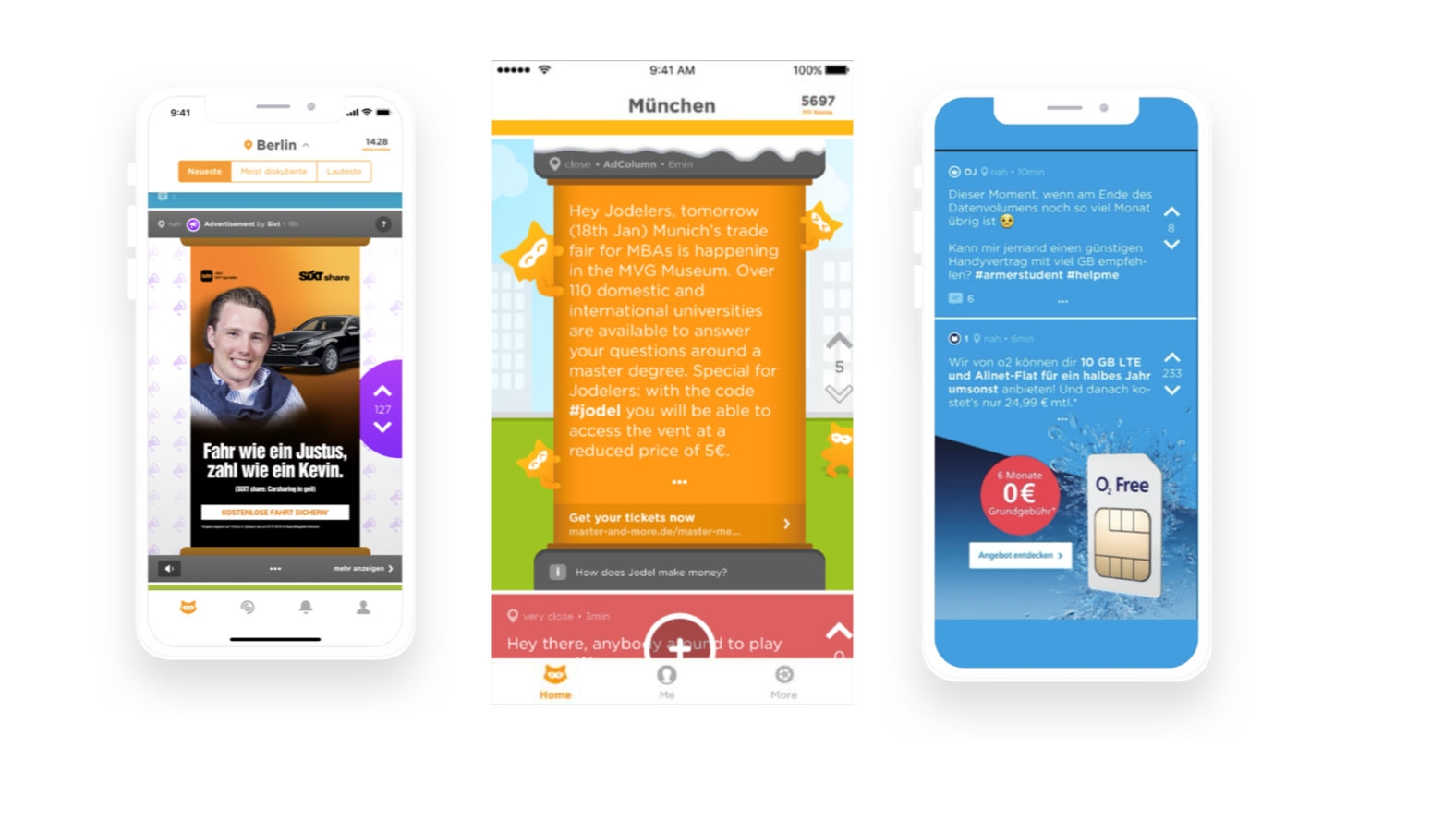 Obwohl Jodel also anonym ist, können Marken ihre gewünschte Zielgruppe durch die Nutzung der Daten zu Alter, Geschlecht, Beruf und Standort gezielt erreichen. Die interessenbasierte Channels bieten außerdem eine zusätzliche Möglichkeit des Targetings. Die Hyperlokalität gibt lokalen Dienstleistern, Shops und Marken die Möglichkeit Beiträge im 10 km Radius eines frei gewählten Ortes auszuspielen und so lokale, digitale Werbung zu schalten. Ein Werbeformat das für Kleinunternehmen sowie große Brands ein interessanter Kanal repräsentiert.