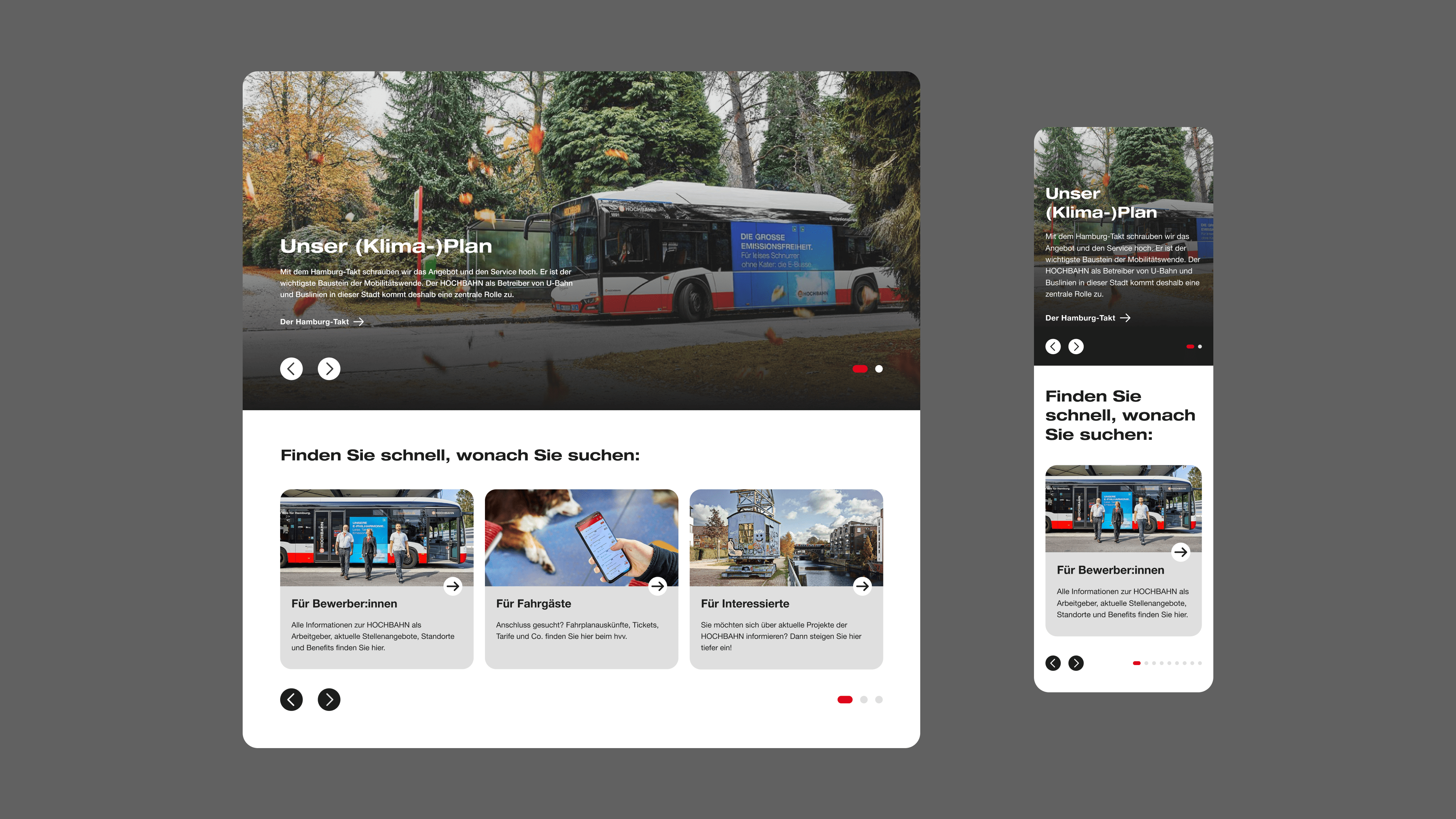 Bei der Entwicklung der neuen HOCHBAHN Website wurde sehr viel Wert auf ein modernes Design, eine sehr gute Usability nach dem Mobile First Ansatz, sowie auf einen geschärften Zielgruppenfokus gelegt. Zur Kern-Zielgruppe zählen in diesem Fall Bewerber:innen, Presse, Politik und alle, an der HOCHBAHN als Unternehmen interessierten Menschen. Die konkreten Anforderungen dieser Nutzer:innen wurden im Rahmen einer gemeinsamen Workshop-Serie zu Beginn des Projekts identifiziert.  Die Schwerpunkte lagen dabei auf den Themen Branding/ Digital Design Direction, Informationsarchitektur, sowie einem User-Story-Mapping. Auf diese Weise wurden essentielle Grundlagen für die Umsetzungsphase erarbeitet.
