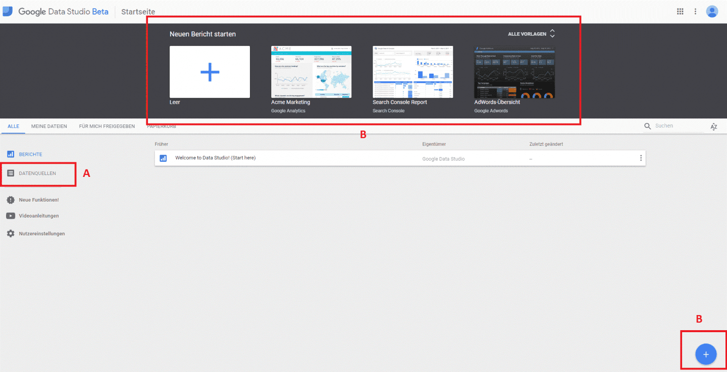 Bevor es jedoch mit der eigentlichen Erstellung von Dashboards losgeht, sollten die Daten „organisiert“ werden. Die Verwaltung kann in der linken Leiste unter Datenquellen erfolgen (Abbildung 2, Punkt A). In dem ersten Teil unserer Data Studio Serie wurde die Vielfalt der Schnittstellen bereits vorgestellt. Hauseigene Dienste von Google lassen sich mit wenigen Klicks sehr bequem anbinden. Für diejenigen, die Data Studio gerne zuerst nur testen wollen, bietet Google Sample-Daten für Analytics, die Google Search Console, Google Adwords sowie viele weitere Tools.