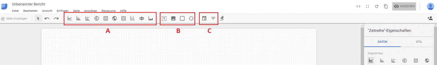 Die Gestaltung des Berichts ist intuitiv. Wie in Abbildung 4 zu sehen ist, stehen in der „Steuerleiste“ oder unter dem Reiter „Einfügen“ zehn Elemente für Daten-Visualisierungen (A), vier Objekte für eine optische Darstellung (B) und zwei Zeitraum- und Steuerungsfilter (C) zur Verfügung.