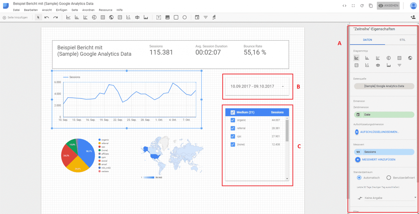 Nicht jedoch die Freiheit in der Gestaltung, sondern die Möglichkeiten Berichte dynamisch darzustellen, machen Data Studio so praktisch. Das Verständnis eines Betrachters von den Daten und Geschehnissen wird zusätzlich untermauert, indem sich der/die Betrachter:in potenzielle Fragen direkt in einem Bericht selbst beantworten kann. Diese ad-hoc Veränderung wird zum einem mit der Zeit (Abbildung 5, Punkt B), zum anderen mit einem Filter – basierend auf den Daten – möglich gemacht (Abbildung 5, Punkt C).