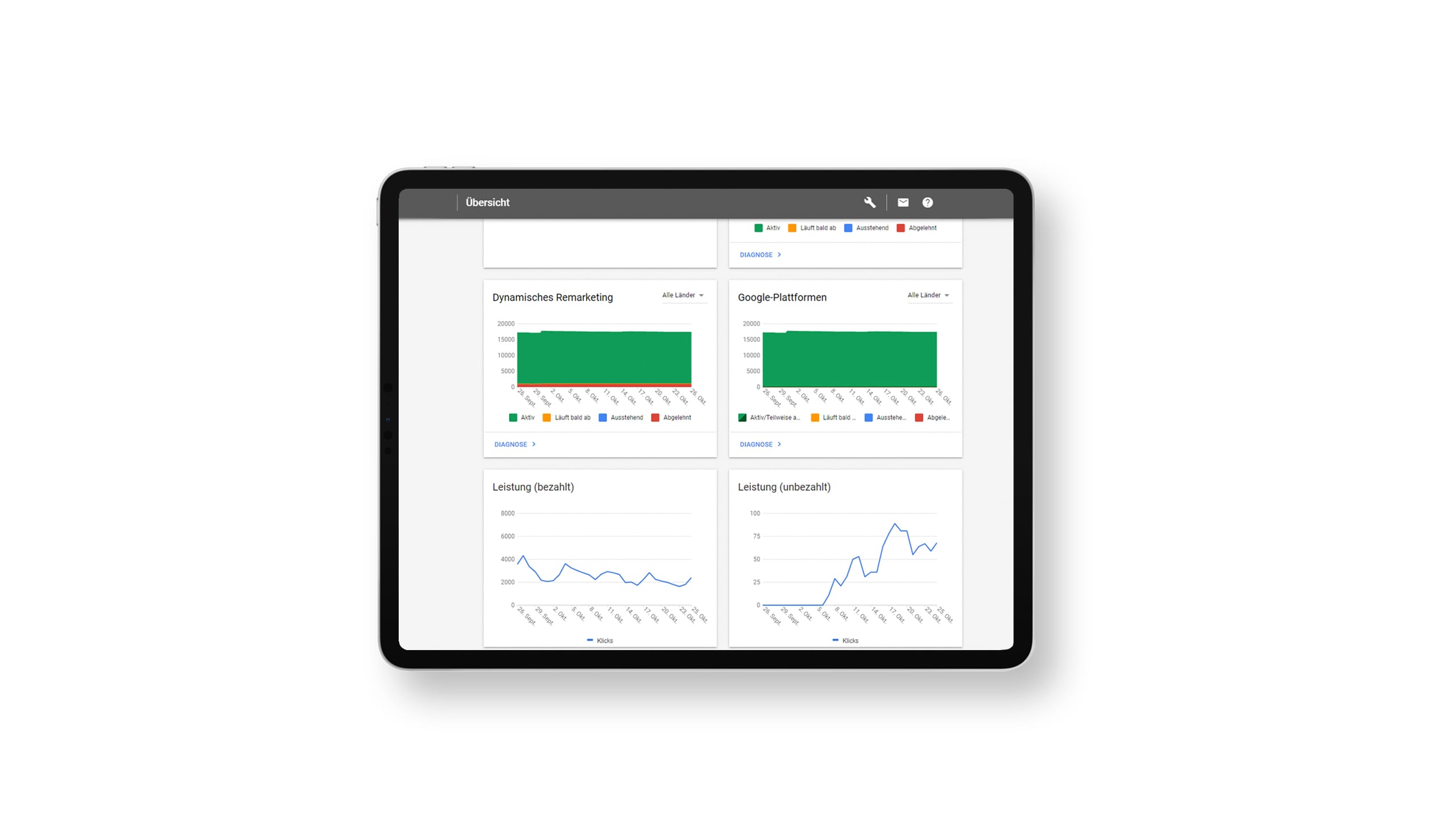 Auf dem Dashboard im Google Merchant Center ist erkennbar, dass “Google-Plattformen” aktiviert ist und das unbezahlte Klicks generiert werden.