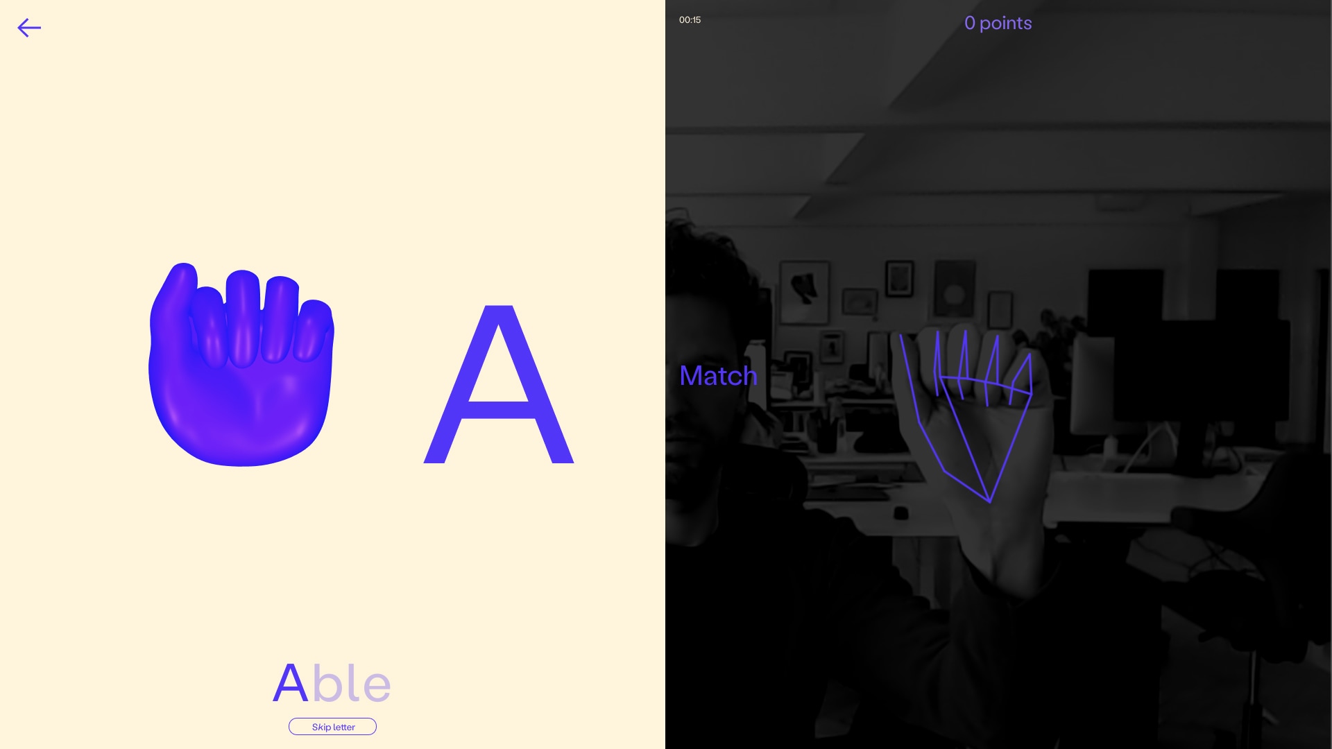 Hello Monday (part of DEPT®)’s projekt Fingerspelling.xyz handler om at give forældre mulighed for at lære tegnsprog (American Sign Language) gennem en browser-baseret app der bruger webcam og machine learning til at analysere din hånds form så du kan lære at bruge ASL-alfabetet korrekt.