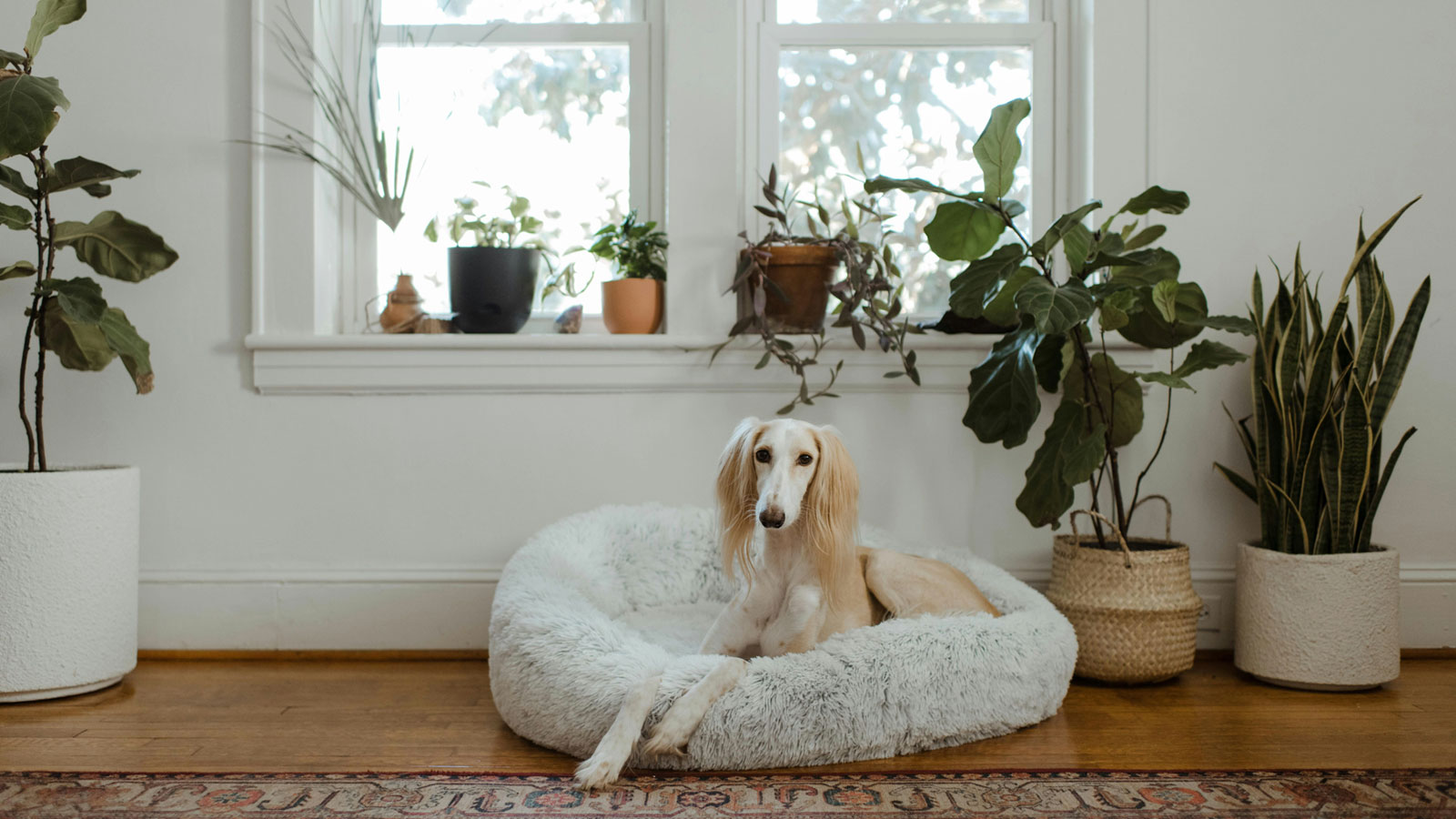 A cream Afghan Hound lounges in a fluffy dog bed, in a room with a wooden floor and house plants.