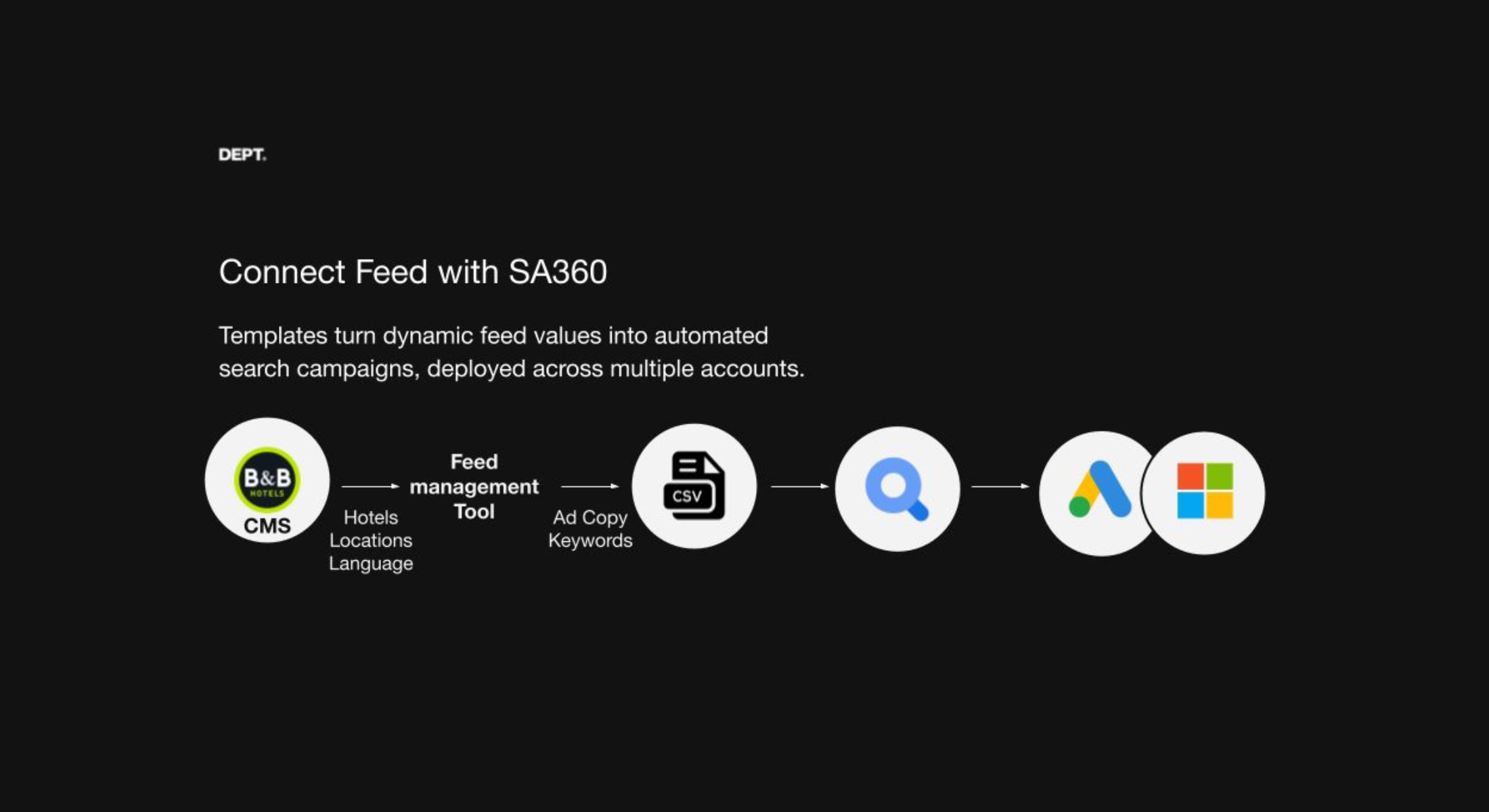 Then, we created input for templates through a feed management tool. It uses data from B&B HOTELS CMS (address, description, and amenities) to build ad copy with specific keywords. For example, we built a headline combining a static call to action, “Book a hotel in,” with the dynamic city element from the feed, “Hamburg.” Then, the output feed gets sent to a template in SA360 to automatically build the search campaigns on the different engines.