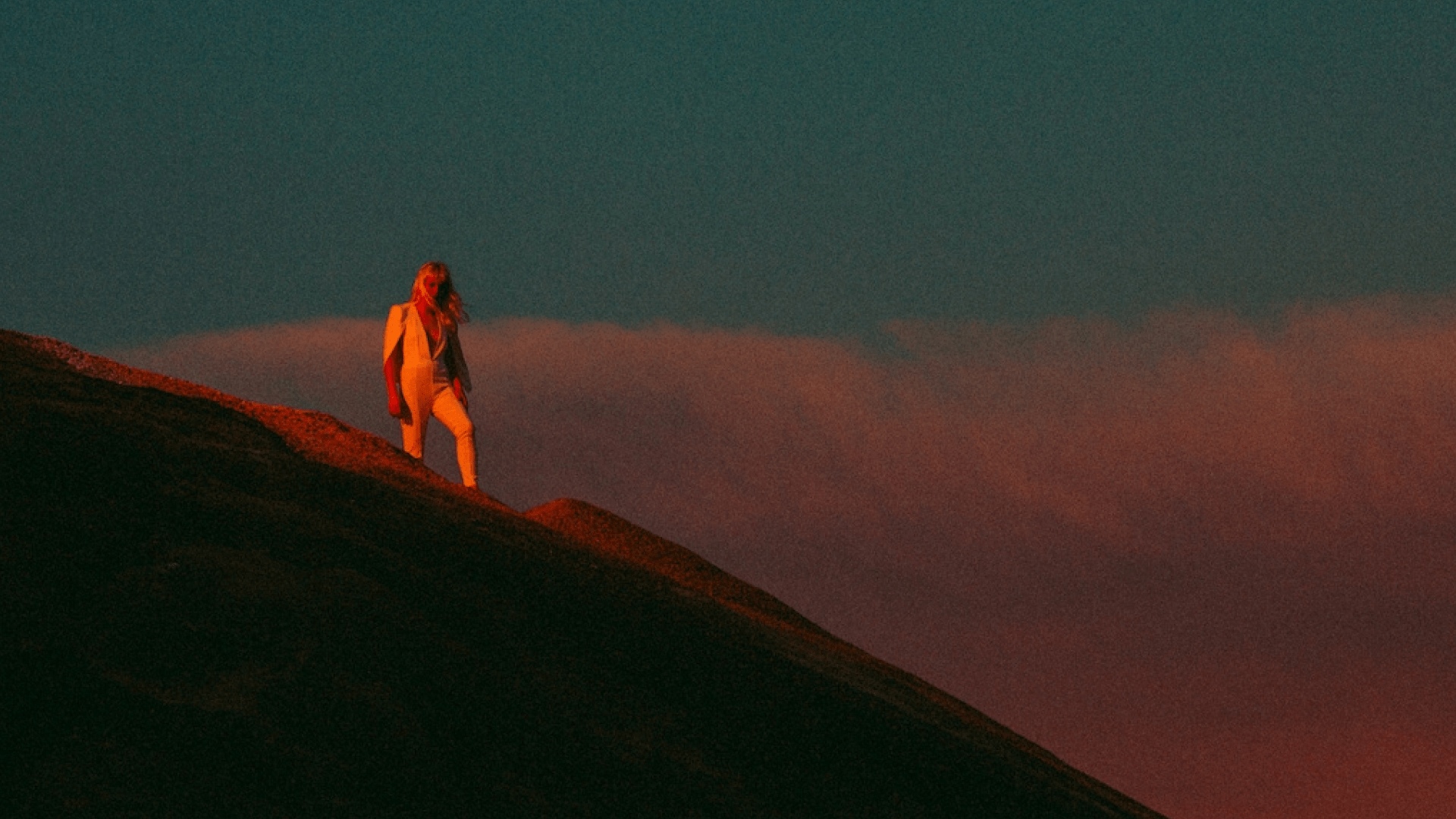 Person with mid length blonde hair standing on top of hill with grainy blue sky and red hues from sundown