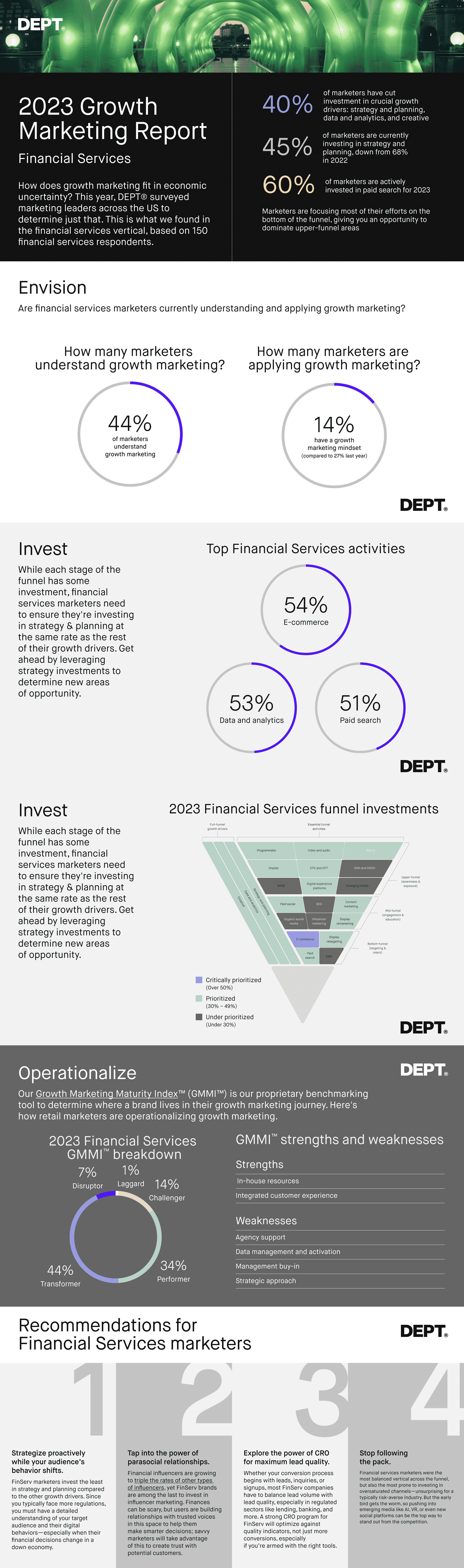 In our annual Growth Marketing Report, DEPT® conducted an extensive survey of 150 marketing leaders within the financial services industry. Our goal was to gain a deeper understanding of how they are managing their organizations in a complex and ever-changing financial landscape. Our research has made a compelling discovery: marketing teams in the financial sector may be missing significant opportunities to increase their brands’ visibility, including by harnessing innovation, data, and customer-centric approaches.