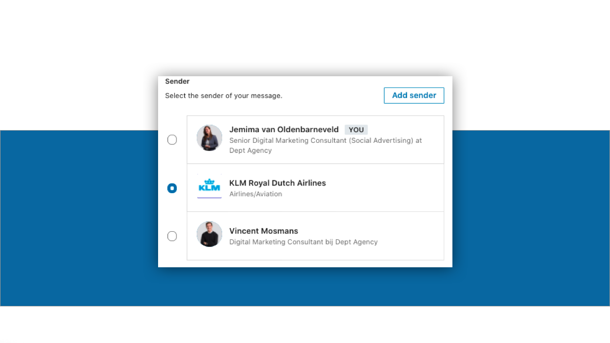Another new feature that was recently rolled out by LinkedIn, is conversation ads. This feature is specifically focused on paid advertising. The ad type can be distributed from the LinkedIn Campaign Manager and can be viewed as a successor to the Sponsored InMail. This advertising message is sent from a personal profile, which means this person will be the sender of the message. Only a few companies currently have the possibility to send a message out of possession of the company itself. By the end of 2020, this will be available for every company.